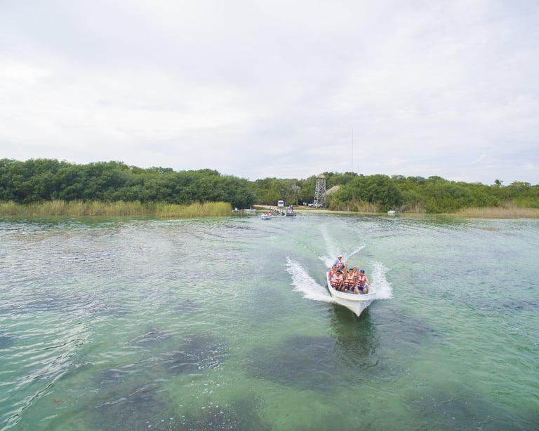 Naviguez à travers des mangroves, un écosystème actif abritant plus de 300 espèces d'oiseaux, de crocodiles, de dauphins, de tortues, de poissons et de flore indigène, une traversée qui nous mènera aux magnifiques eaux du Mexique où nous pratiquerons le snorkeling dans l'un des récifs les mieux préservés de la région.